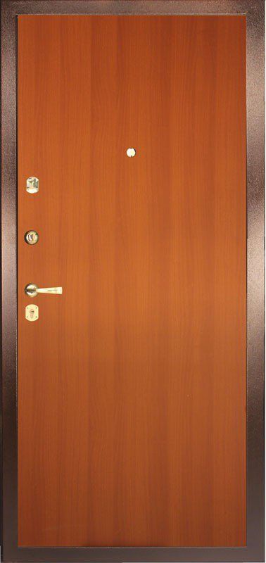 Ламинированные с внутренней стороны двери снаружи можно отделать любым способом - от экономичной винилискожи до премиального массива или натурального шпона, декорированную зеркальными вставками, витражом, кованными элементами.