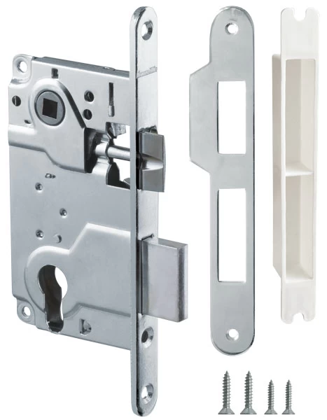 В комплект входит: замок, ответная планка, декоративная заглушка, комплект крепежа. Материал корпуса: сталь, материал планки и язычка: ZAMAK. Гарантия 5 лет.